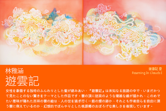 水墨画と日本画は質感が非常に近く、二つが融合することで、瑞々しさと穏やかさが溢れ、また、鉱物顔料の中のかすかな光の反射により、作品に気品がプラスされています。女性アーティストである林雅涵氏は、絵を描くことでその時の感情を記録し、また、細く繊細で滑らかな特徴によって、細やかで、互いに結びつきながら織り成す姿を描き出します。さらに、絶えず心の中の様々な感情を表現しており、言葉で表現しがたい感情が作品に描き出されています。